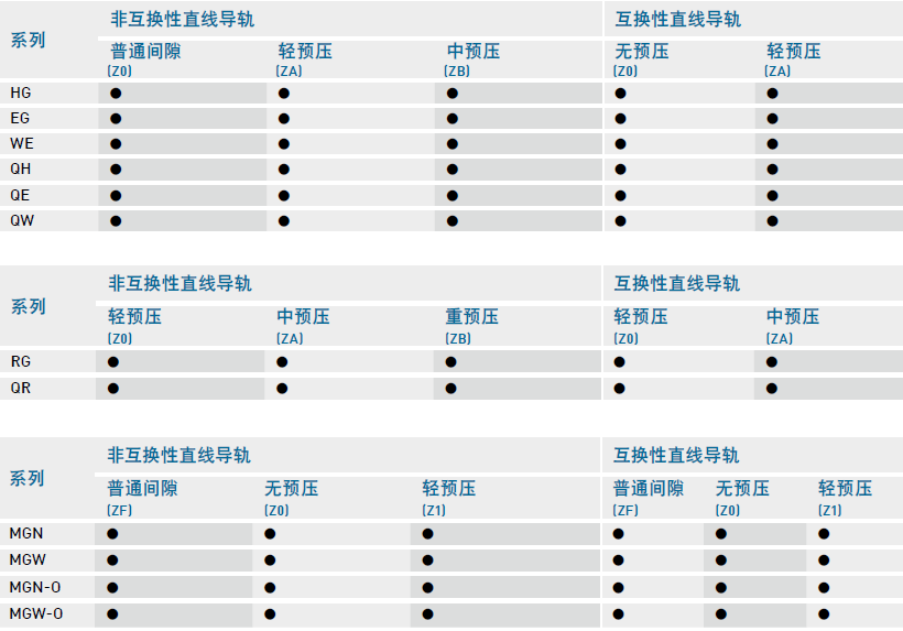 上銀直線導軌系列精度等級及預壓等級表