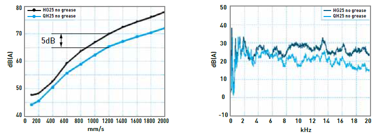 利用同步聯結器可使滾珠均勻等間隔的排列,滾珠與滾珠間的相互撞擊金屬聲消失,尖銳的高頻聲音強度有效降低(見右下圖)??偤偷穆曇魪姸扰c舊有系列比較在各個速度域有效降低約5分貝(見左下圖)。