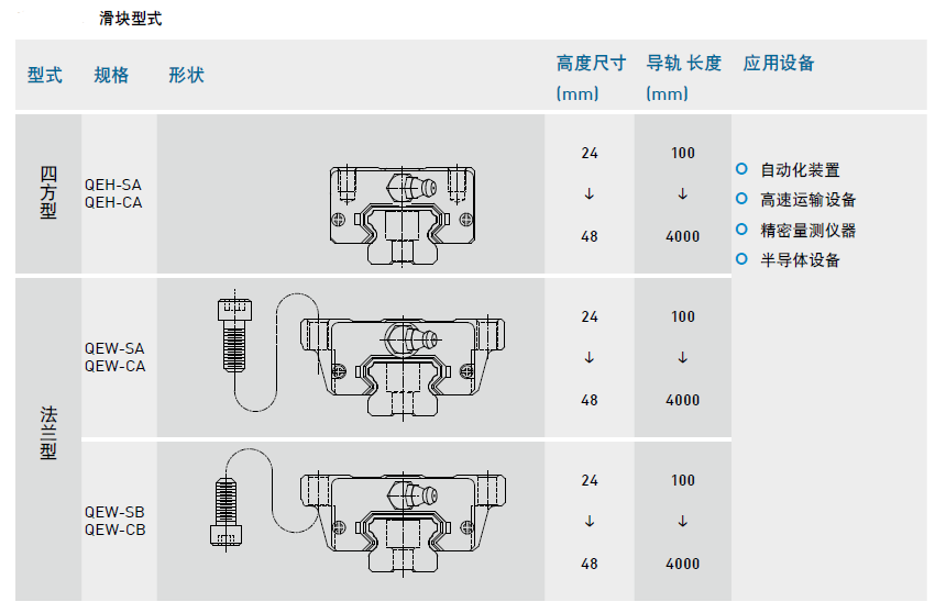 QE系列靜音式低組裝型滾珠直線導軌,乃基于四列式單圓弧牙型接觸設(shè)計,降低組合高度與縮短滑塊長度,非常適合高速自動化產(chǎn)業(yè)機械及空間要求的小型設(shè)備使用。采用SynchMotionTM技術(shù)的QE系列直線導軌搭載具儲油功能的專利同步聯(lián)結(jié)器,可有效降低運轉(zhuǎn)時噪音、提升運轉(zhuǎn)平順性、壽命與潤滑效率。具有更廣泛的產(chǎn)業(yè)應(yīng)用性,更適用于高速、寧靜與低發(fā)塵需求的高科技產(chǎn)業(yè)。