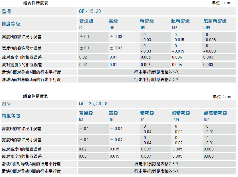 靜音式低組裝QE系列直線導軌精度等級對照表
