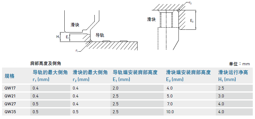 3、安裝注意事項, 我們在超導軌的時候,要注意安裝面肩部高度及倒角,安裝直線導軌時必須注意安裝面肩部的狀況是否適當,如倒角過大,凸出的地方易造成直線導軌精度不良,而高度過高則會干涉滑塊。故如果能依照建議要求安裝面肩部,安裝精度不良即可排除。下表為QW靜音安裝面肩部高度及倒角相關(guān)參數(shù)。