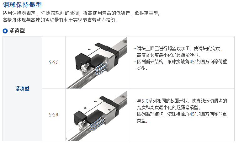 S系列使用四列鋼珠承受負(fù)荷設(shè)計,使其具備高剛性、高負(fù)荷的特性,同時具備四方向等負(fù)載特色、及自動調(diào)心的功能, 可吸收安裝面的裝配誤差,得到高精度的訴求。 加上降低組合高度及縮短滑塊長度,非常適合高速自動化產(chǎn)業(yè)機(jī)械及空間要求的小型設(shè)備使用。
